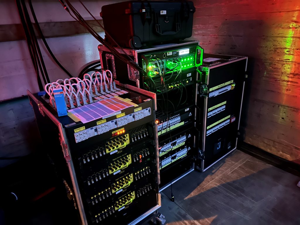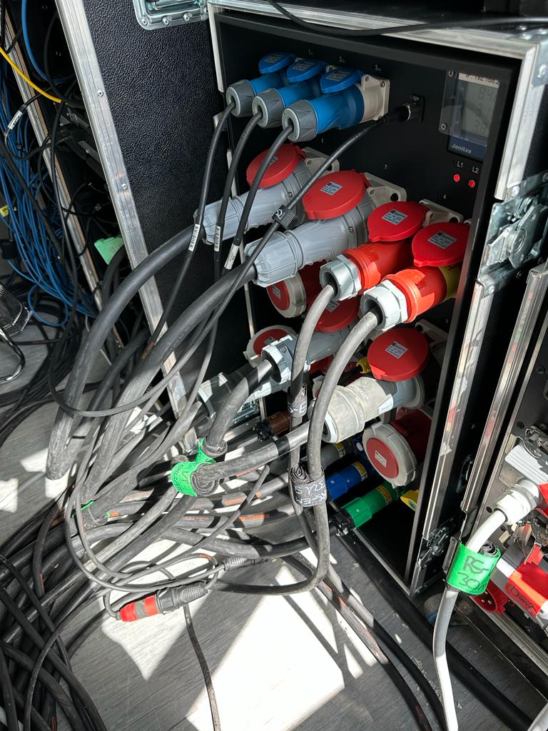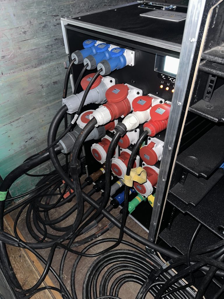 Die Stromversorgung des Eppinger Sommerfestivals 2023 ca. 240 Meter 400A Powerlock Kabel aber auch alle Verbraucher wurden von uns versorgt und verkabelt (z.B der Caterer, die Bühne oder die Container mit Toiletten, Backstage). Dabei war selbst ein 8 Meter breiter Bachgraben kein Hindernis, der Weg wurde behinderten Gerecht mittels Rollstuhl-gerechter Kabelbrücke überquert.